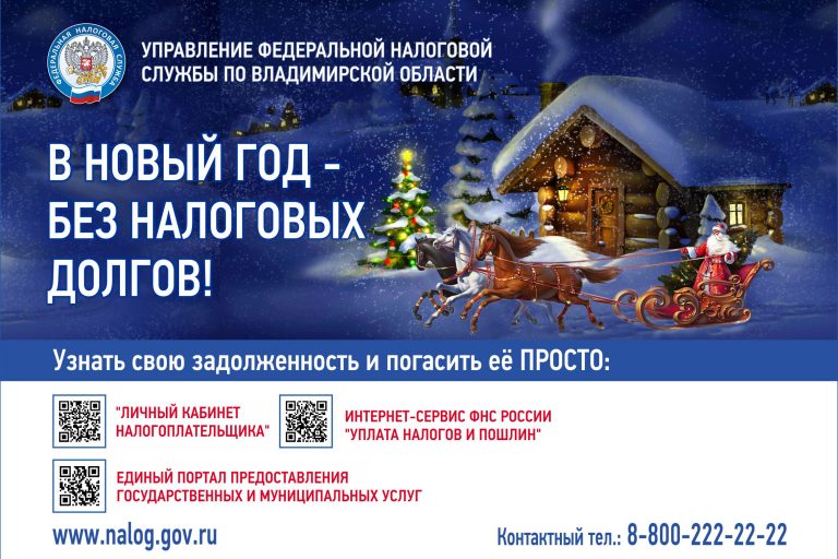 С целью напоминания гражданам о необходимости своевременной оплаты налогов и разъяснения мер ответственности за неуплату, налоговые органы Владимирской области проводят акцию «Новый год без долгов». Если налоговое уведомление не получено, а облагаемое налогами имущество (транспортное средство, земельный участок, жилое помещение, садовый дом, гараж и т.п.) имеется, это повод обратиться в налоговую инспекцию и уточнить данные.…